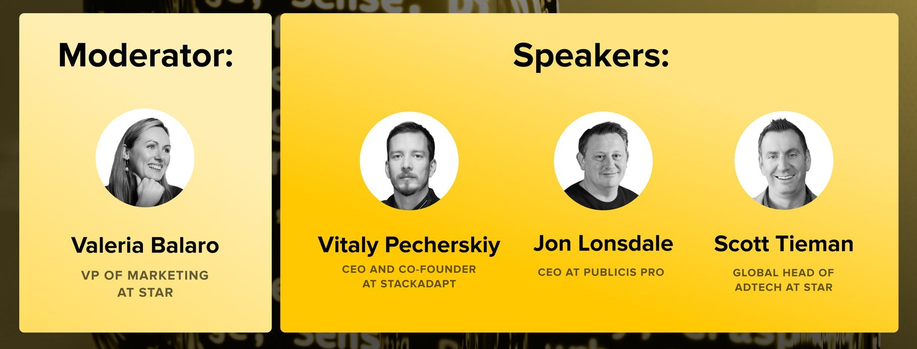 このウェビナーでは、Starのアドテック部門グローバル責任者であるScott Tiemanと、Publicis ProのCEOであるJon Lonsdale氏、StackAdaptのCEO・共同創設者であるVitaly Pecherskiy氏がライブで対談。生成AIが急激な変化をもたらす可能性、ハイパーパーソナライゼーションの落とし穴、AIツールを商業化する方法などが話題にのぼりました。また、Lonsdale氏が、Publicis Proが最近発表した生成AIツール「B2B Lab」をプロダクト化するまでの道のりを紹介しました。